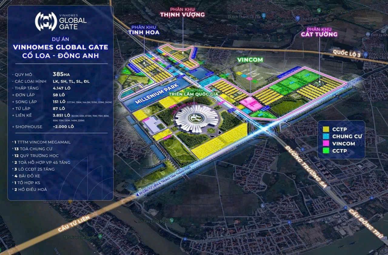 Sở hữu quỹ đất rộng lớn lên tới 385ha, dự án Vinhomes Global Gate Cổ Loa Đông Anh dự kiến trở thành nơi cư trú cho gần 80.000 cư dân với đa dạng loại hình bất động sản phù hợp với nhiều tệp khách hàng khác nhau: Căn hộ, biệt thự, shophouse, liền kề,...